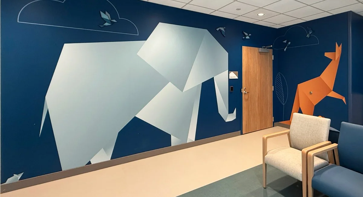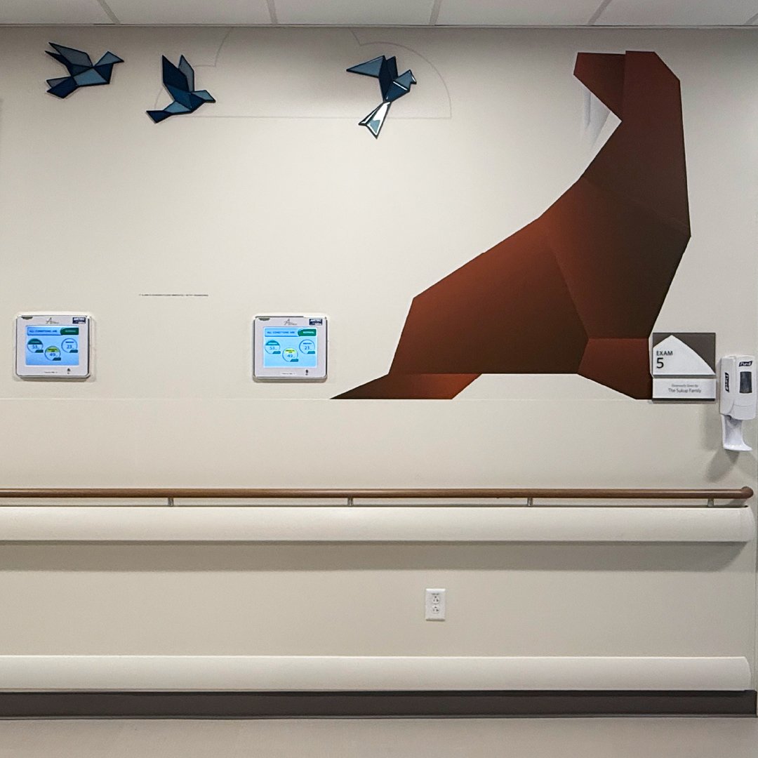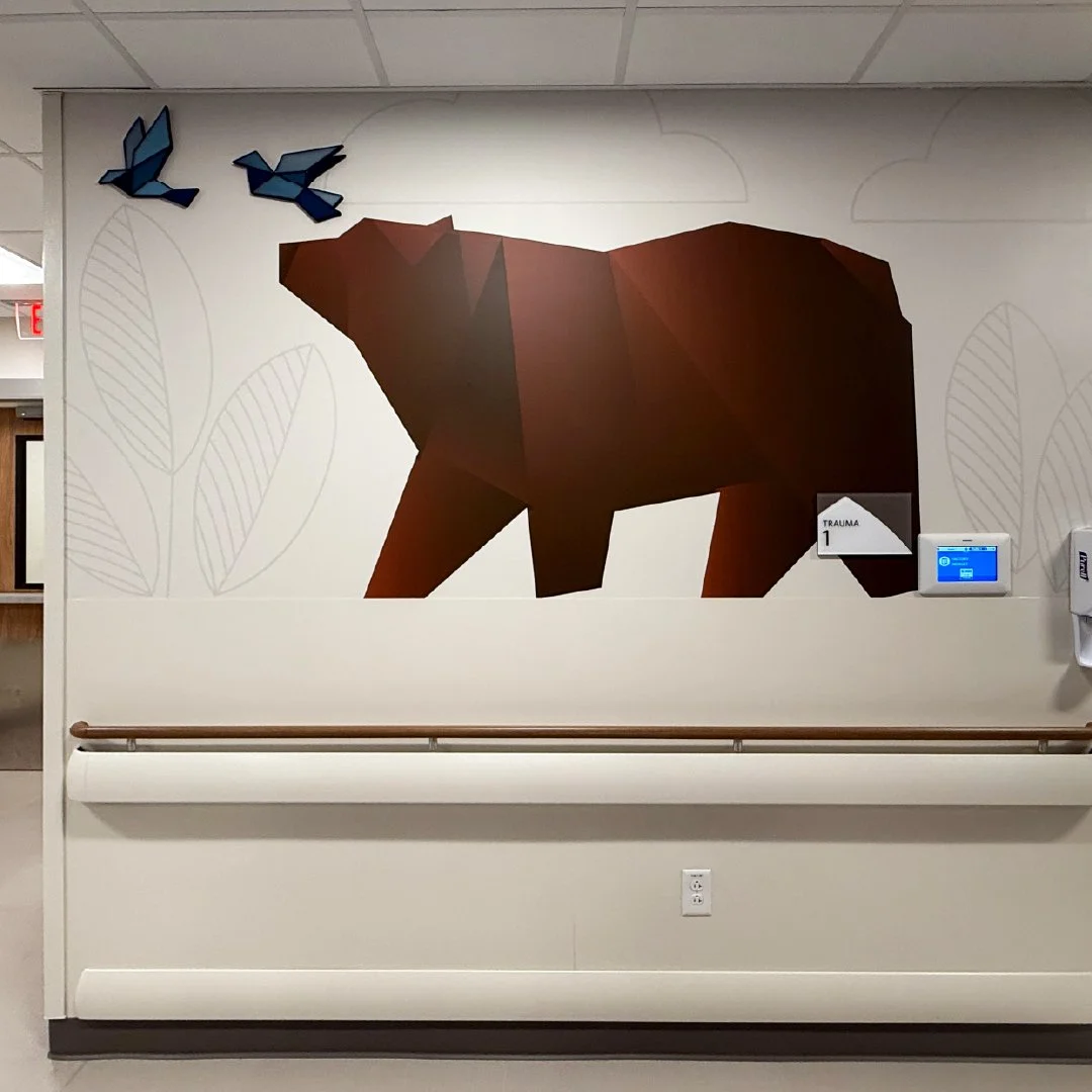Our friends at Insite Art invited us to develop custom graphics for a new children’s hospital. We truly enjoyed designing and illustrating a collection of origami animals to fill the corridors and patient rooms. These friendly critters welcome families dealing with all types of issues into a comfortable, engaging environment.