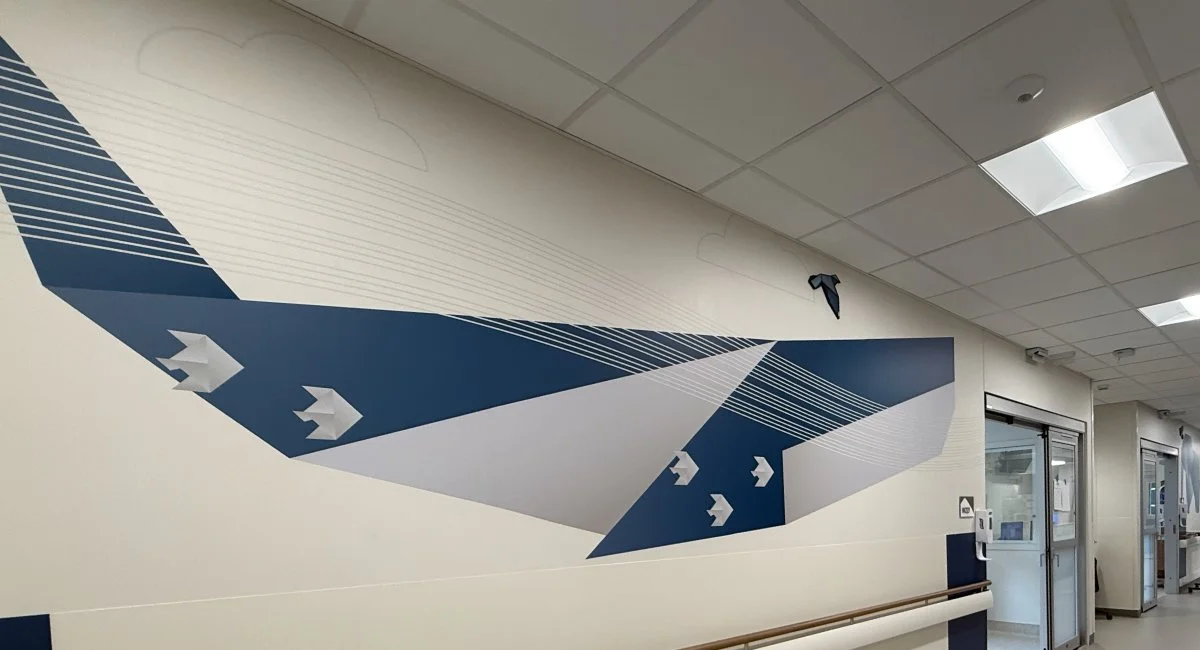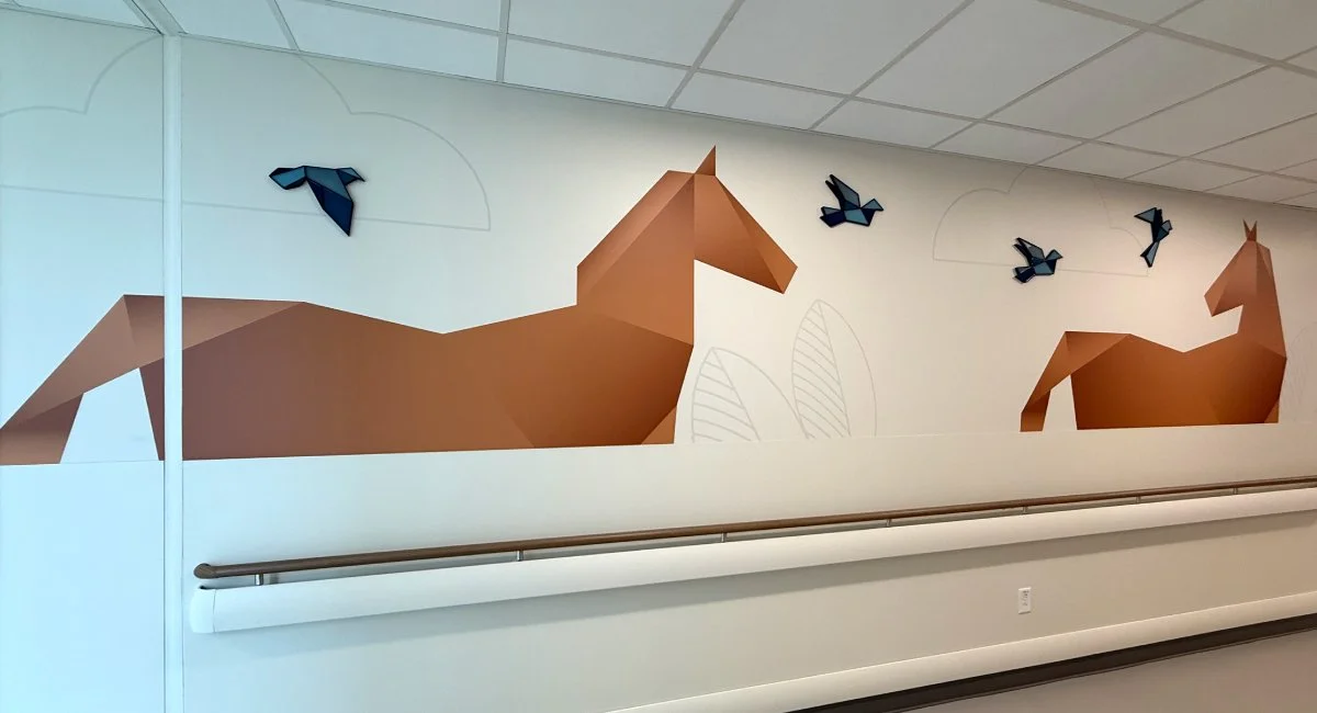Patients encounter these cordial characters from the moment they arrive in the lobby. Anyone experiencing a healthcare event will appreciate the graceful nature of these life-size ambassadors offering a calm, cheerful atmosphere. Plus a flock of birds scattered throughout the hallways and rooms act as a breadcrumb for new visitors exploring the space. Some of the flock are rendered as 3D sculptures, literally coming off of the wall!
